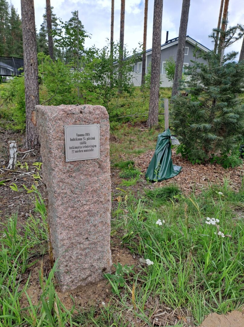 Surmattujen omainen, Antti Vanhanen loi katsauksen niihin tunteisiin mitä keväällä 1918 on voineet surmattujen omaiset tuntea ja surra. Vanhanen kiitti myös kaikkia muistomerkkin ja puun istutukseen osallistuneita tahoja ja hankkeen työryhmää. Muistolaatassa on teksti; Vuonna 1918 huhtikuun 25. päivänä tällä paikalla tutkimatta teloitetun 22 miehen muistolle.