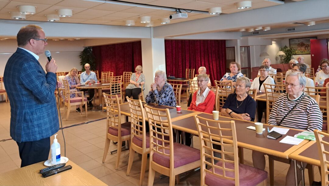 Pekka Timonen puheenvuoronsa aluksi. Hän vieraili 11.9. Vantaan Wanhojen