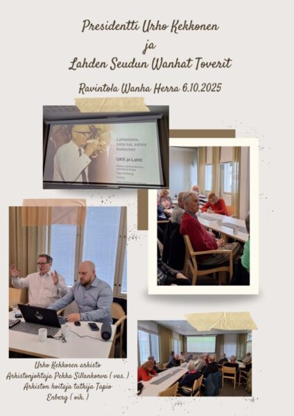 PRESIDENTTI URHO KEKKONEN JA LAHDEN SEUDUN WANHAT TOVERIT Urho Kekkosen arkistonjohtaja Pekka Lähteenkorva ja arkiston tutkija Tapio Enberg vierailivat Lahden seudun
